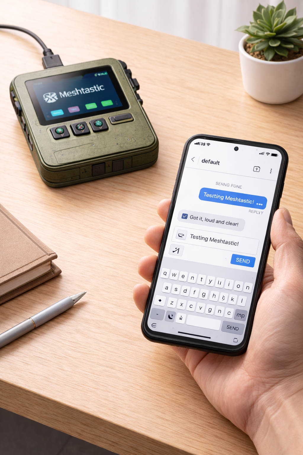 Next, you’ll send your first message — either directly on the device using the joystick, or through the Meshtastic app for faster typing.